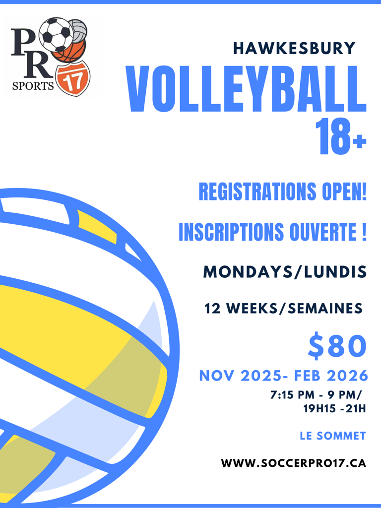 PRO17 Sports Hawkesbury débute la saison volleyball 2025 le lundi 10 novembre 2025 à l'école secondaire publique Le Sommet de Hawkesbury, située au 894, boulevard Cécile. Les séances de volleyball auront lieu les LUNDIS de 19 h 30 à 21 h pendant 12 semaines. Voici les dates :